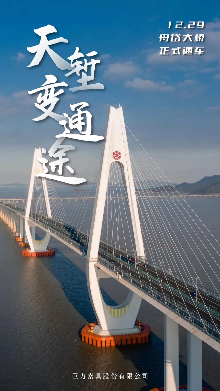 寧波舟山港主通道項目作為滬舟甬跨海大通道的重要組成部分,建成后與甬舟高速相連,使舟山連島工程總建設里程達到83公里,跨越8個島嶼,擁有10座大橋,除舟岱大橋,巨力索具還承接了南通航孔橋、富翅門大橋、金塘大橋的斜拉索安裝工作。