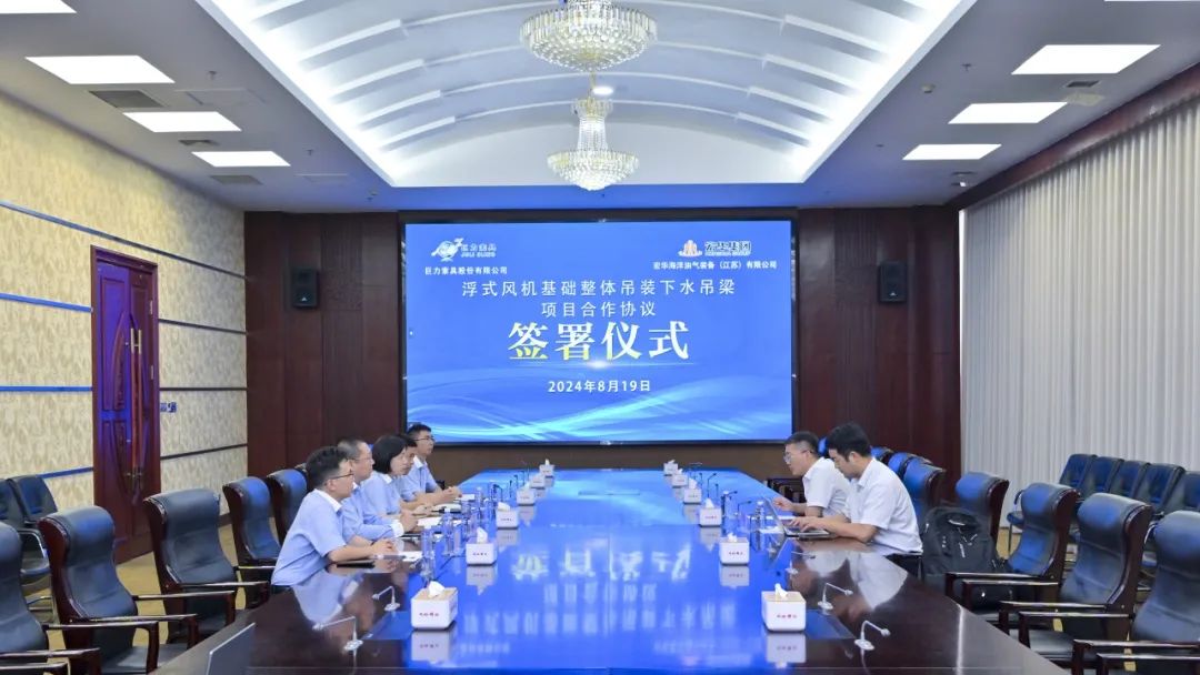 8月19日,巨力索具與宏華海洋油氣裝備(江蘇)有限公司(以下簡(jiǎn)稱宏華海洋)就“浮式風(fēng)機(jī)基礎(chǔ)整體吊裝下水吊梁”簽署項(xiàng)目合作協(xié)議。巨力索具常務(wù)副總裁李彥英、宏華海洋副總經(jīng)理呂巖分別代表雙方簽署協(xié)議。巨力索具副總裁張海波、宏華海洋技術(shù)副部長(zhǎng)李博參加會(huì)議。