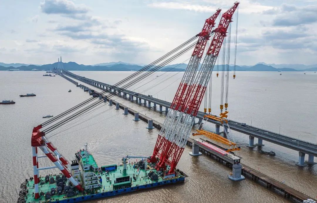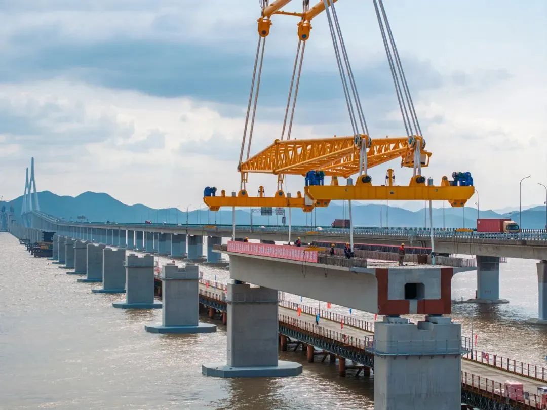 11月5日,隨著現(xiàn)場指揮一聲令下,國內(nèi)首座市域(郊)鐵路跨海大橋,重1700噸的預(yù)制箱梁穩(wěn)穩(wěn)落至橋墩上,巨力索具箱梁吊具全程保障首榀箱梁成功架設(shè),標(biāo)志著大橋全面進(jìn)入上部結(jié)構(gòu)施工階段。