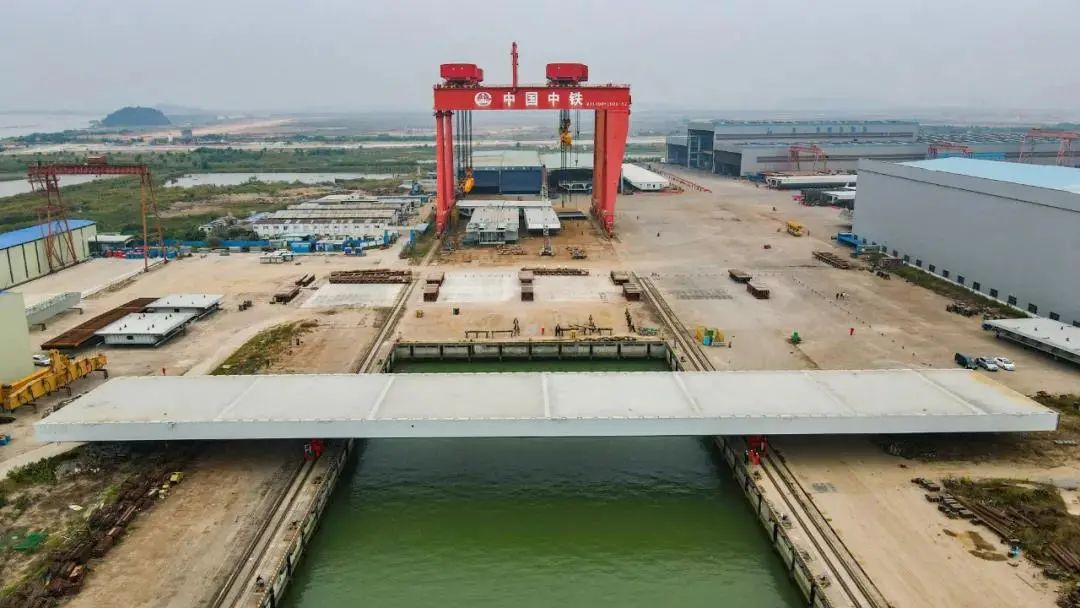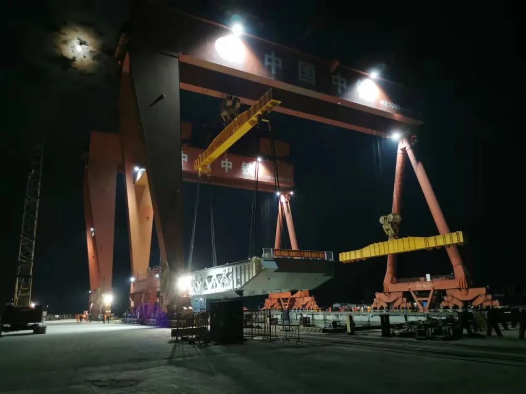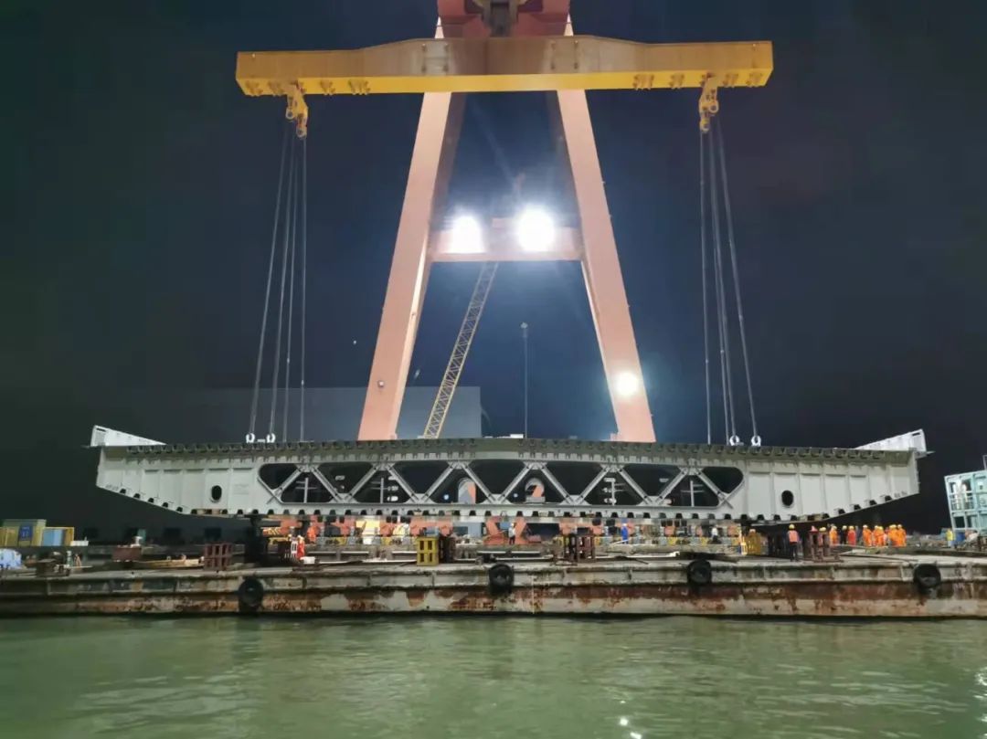 深中通道G05標段泄洪區(qū)及淺灘區(qū)鋼箱梁大節(jié)段XG9L的出海平臺方案為世界首創(chuàng)的出海運輸方案,整個運輸過程使用8臺模塊車,4臺移梁平車,頂升運載能力可達2000噸。經過三次頂升及運輸,將鋼箱梁大節(jié)段XG9L從存梁區(qū)運至待裝船區(qū),由世界第二起重能力的“天一號”運架一體船將鋼箱梁吊運至橋址。