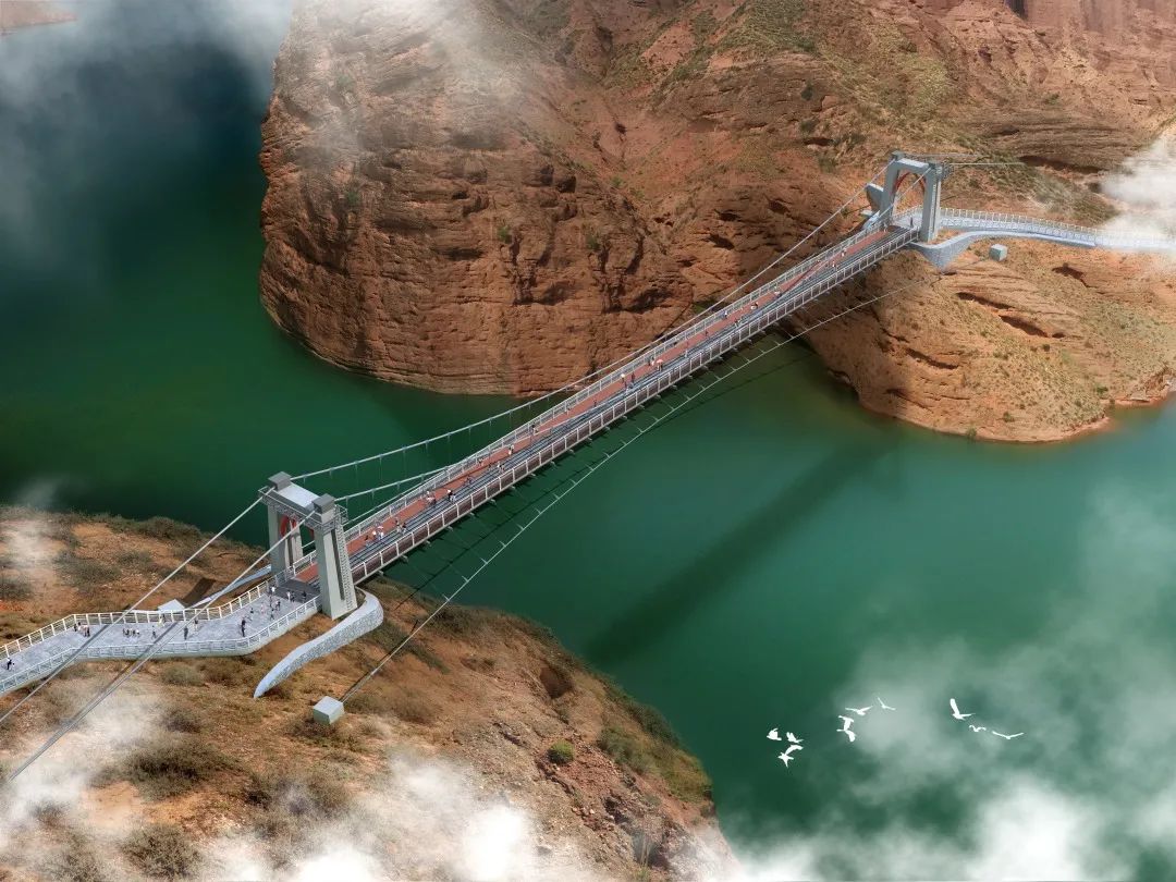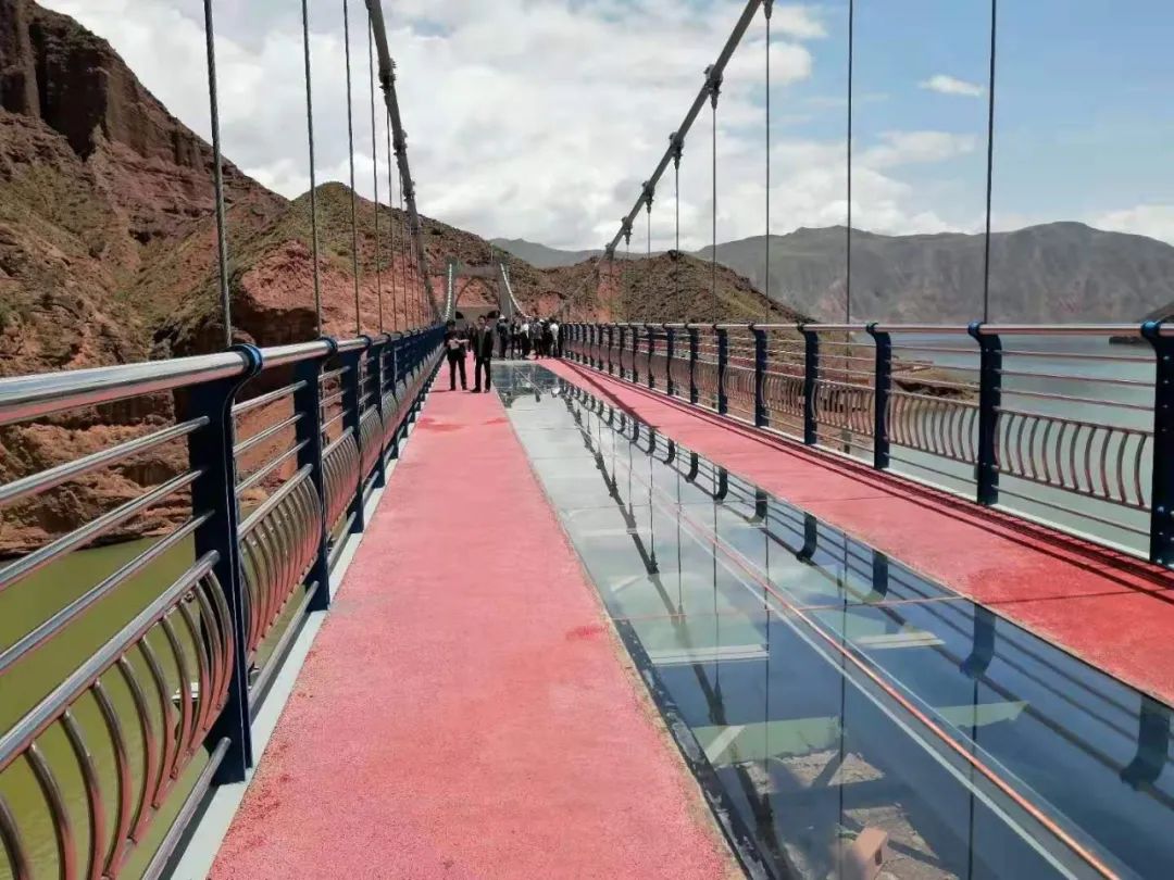 青??膊祭皡^(qū)人行懸索橋全程跨度110米,橋梁寬6米,人行道凈寬5米。大橋位于李家峽水庫入口附近,橋梁連接水庫入口兩岸,兩端連接旅游人行棧道,坎布拉丹霞地貌多以奇峰、峭壁為其主要地貌特征,生態(tài)環(huán)境脆弱,大橋兩岸地勢陡峭,工程地質條件極為復雜,對產品要求極高。